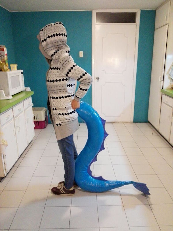 Sobre el traje lo hice durante ese glorioso mes de Junio que tenia muchos trabajos pendientes. Cuando volví de Cali tuve como 5 días para terminar todo: la cola, el traje, el cuerno y el tridente. Hace mucho tiempo que no hacia un traje de Anime!